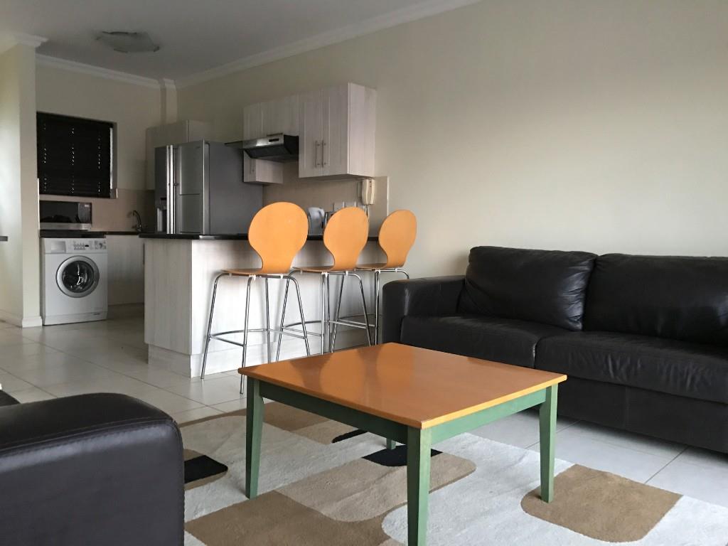 The lounge is fully furnished with a three-seater couch and a two-seater couch leading to a balcony. The kitchen is equipped with a double door fridge, microwave and washing machine. The apartment also has curtains and blinds throughout.